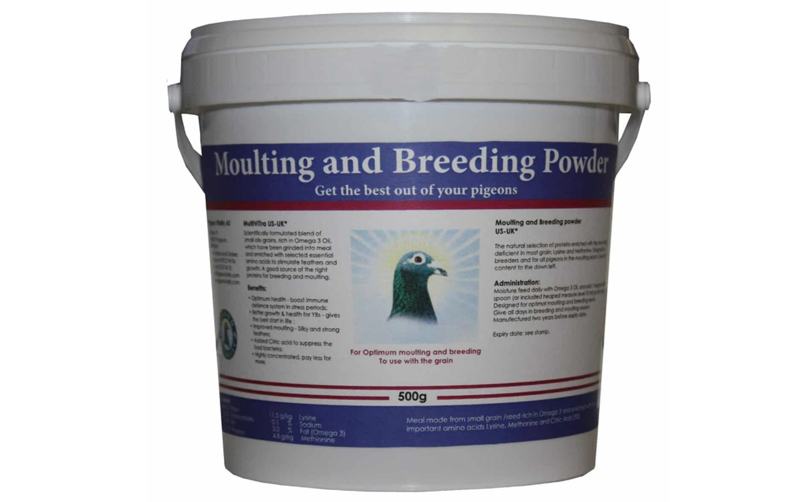 Moulting: 1 spoon daily per kilo grain in the most intensive moulting period. Moisture the grain Pigeon Vitality Omega 3